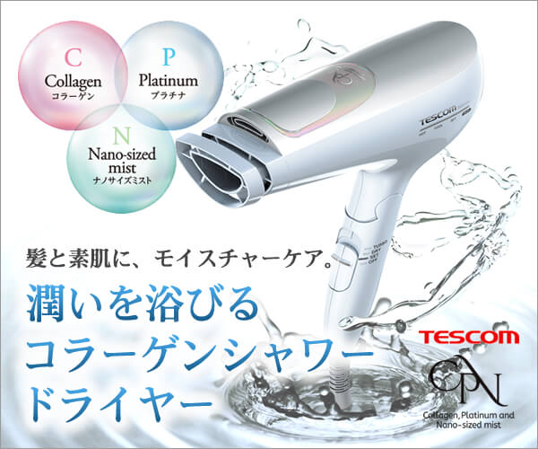 ◆TESCOMコラーゲンドライヤーとは?◆ TESCOM(テスコム)は、美容専売ドライヤーのパイオニア的存在。 Nobbyなど美容室シェアNo1ドライヤーも扱っているメーカーです。 そのメーカーから発売されたのが、コラーゲンドライヤー。 独自技術「CPN」でドライヤーの風にコラーゲンをのせ、髪とお肌のスキンケア感覚で毎日のお手入れに取り入れることを可能にしました。 ◆詳細◆ 【ドライヤー】 コラーゲンイオンヘアードライヤー 品番:TCD5100 価格:\19,880(税別) [特徴] ・独自技術「CPN(シーピーエヌ)」 ・水分を補い、髪と肌のうるおいをキープ ・カラーリング・白髪染めも長持ち ・紫外線にも負けない強い髪へ ・パサつき回避 ・余分な皮脂もすっきり ・頭皮ケアに ・スカルプケア ・お肌にも使用可(スキンモード) ・素肌の乾燥を防ぐ ・健やかな肌へ ◆正規販売店◆ メーカー認証正規販売店として、メーカーより許可をいただき正規販売しております。